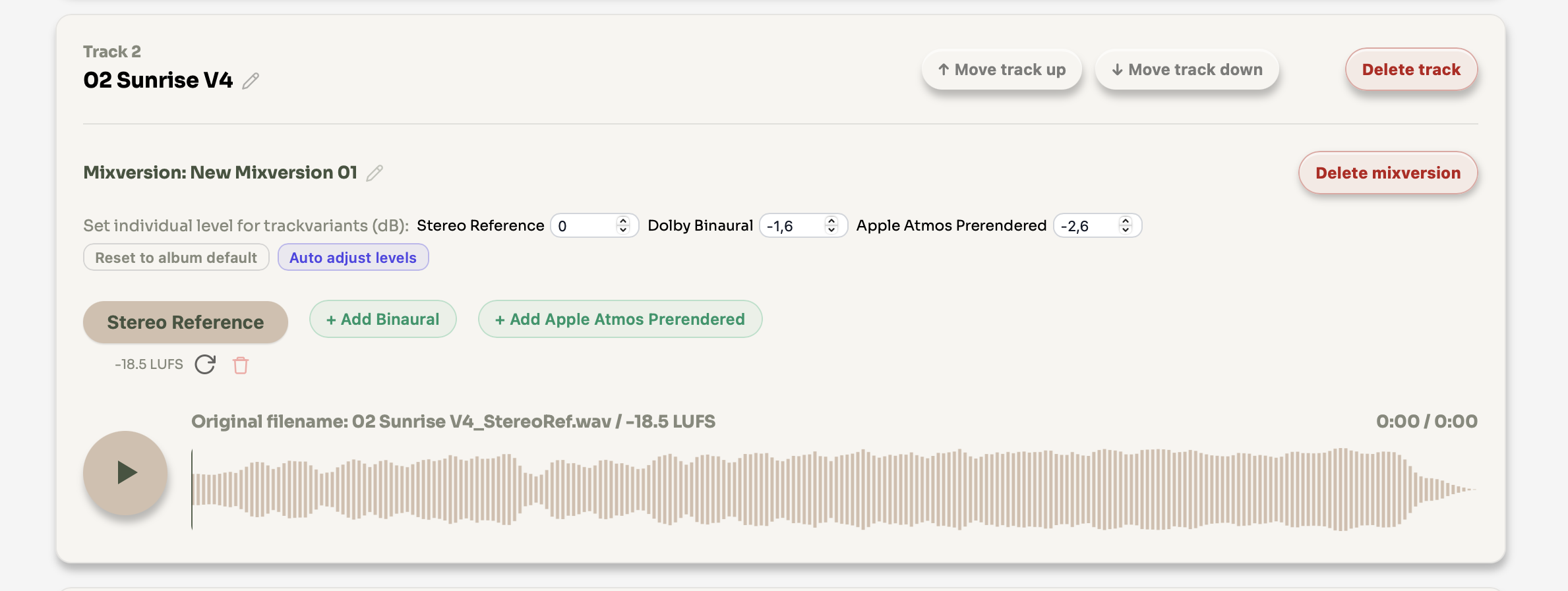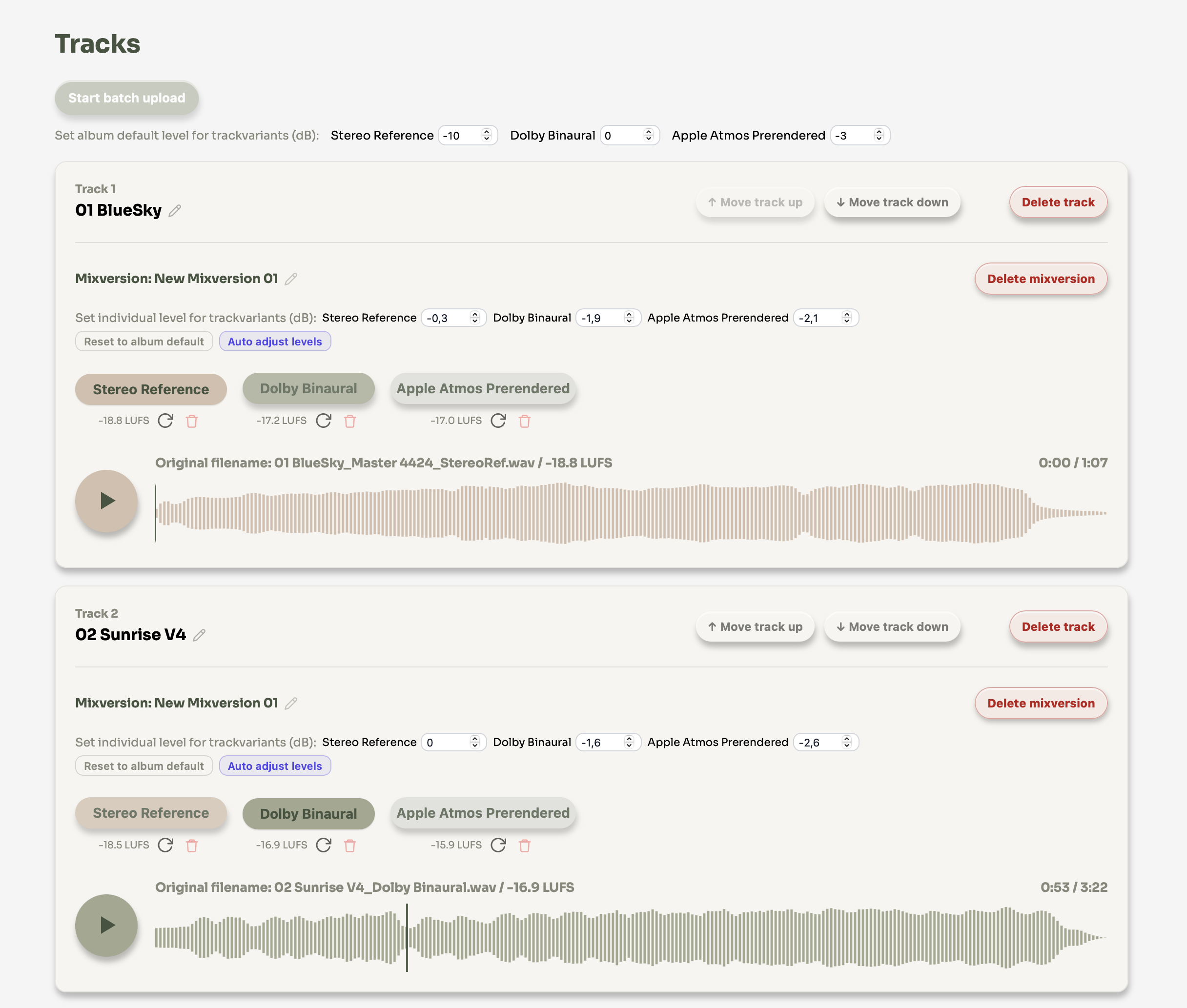 Different mix variants naturally have different loudness levels. Level settings let you compensate for this so clients always hear a fair, consistent comparison, without any variant sounding louder just because of its format.