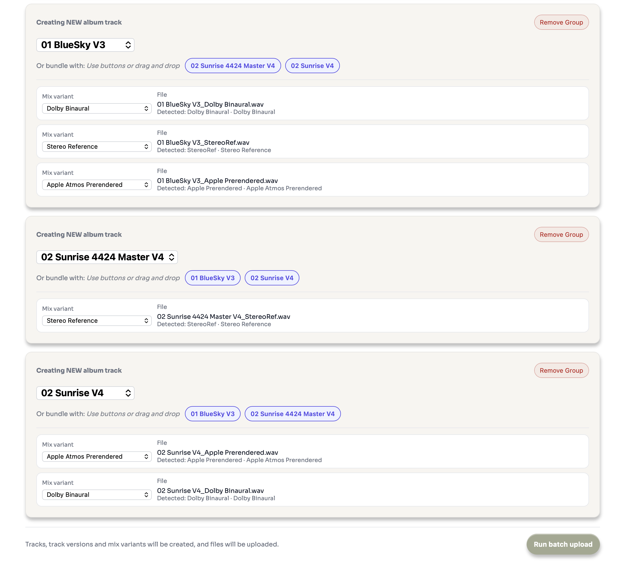 01 BlueSky V3_StereoRef.wav, 01 BlueSky V3_Dolby Binaural.wav, 01 BlueSky V3_Apple Prerendered.wav, 02 Sunrise 4424 Master V4_StereoRef.wav, 02 Sunrise V4_Apple Prerendered.wav and 02 Sunrise V4_Dolby Binaural.wav creates three bundles: 01 BlueSky V3 (Stereo Reference + Dolby Binaural + Apple Atmos Prerendered), 02 Sunrise 4424 Master V4 (Stereo Reference only) and 02 Sunrise V4 (Apple Atmos Prerendered + Dolby Binaural).Supported formats