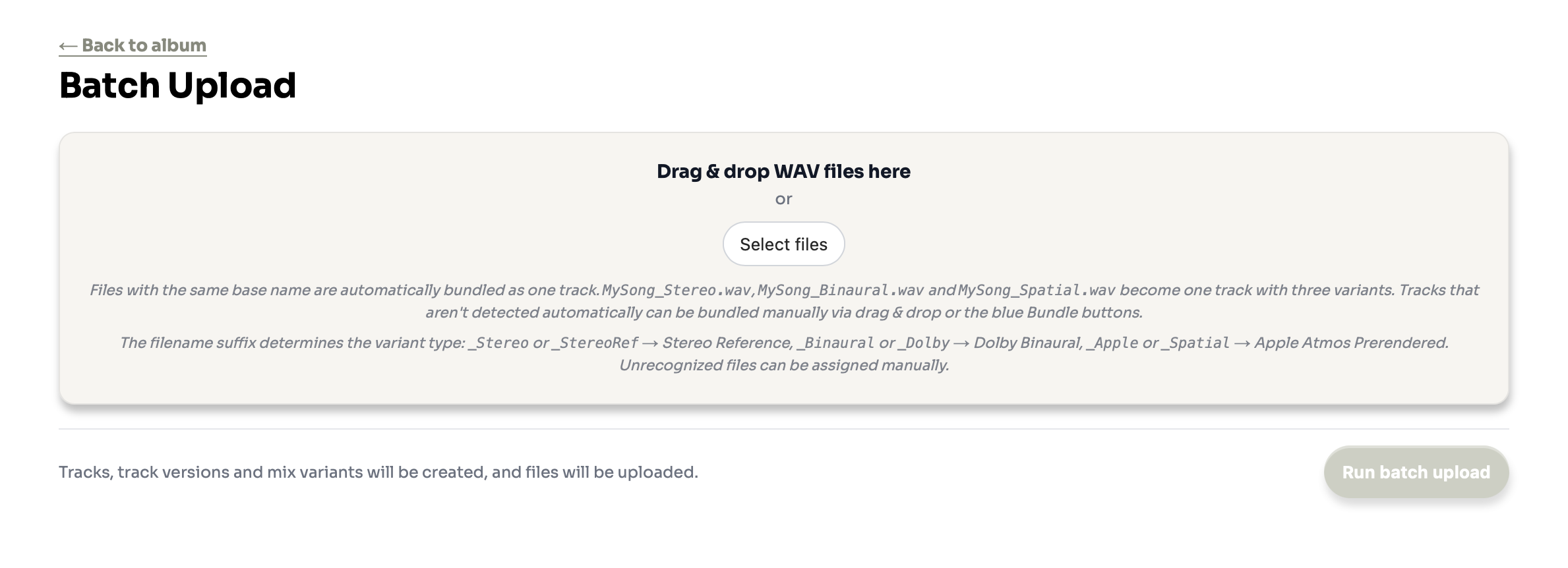 Stereo, StereoRef, Dolby, Binaural, Apple, Spatial, JOC, Atmos. If no variant keyword is found, the full filename is used as the track name without a variant assignment.How to batch upload