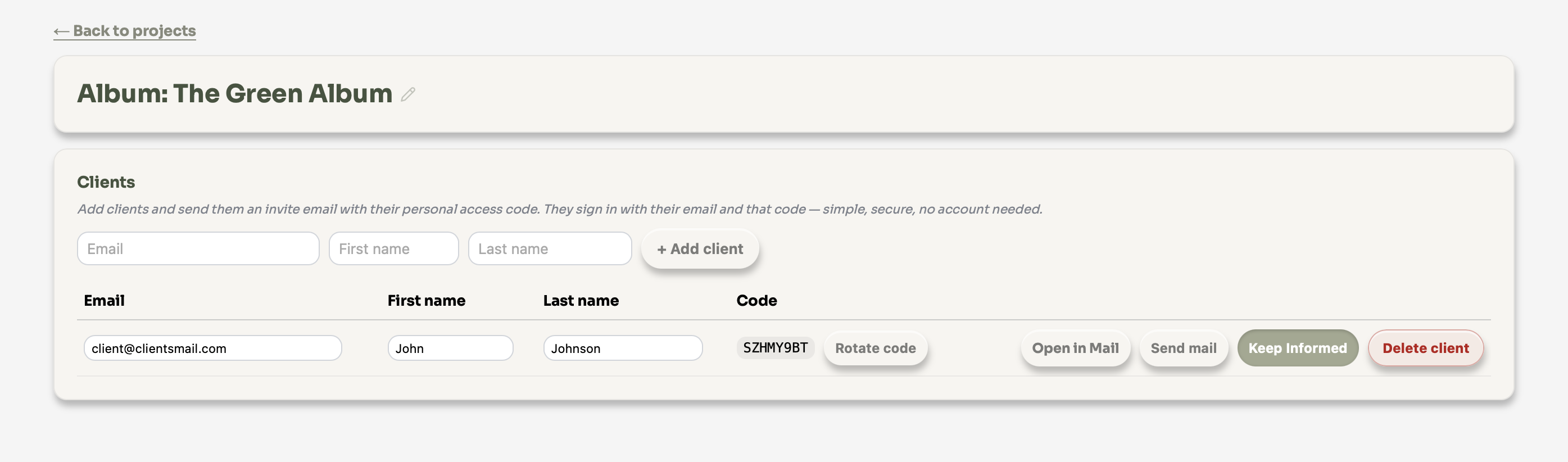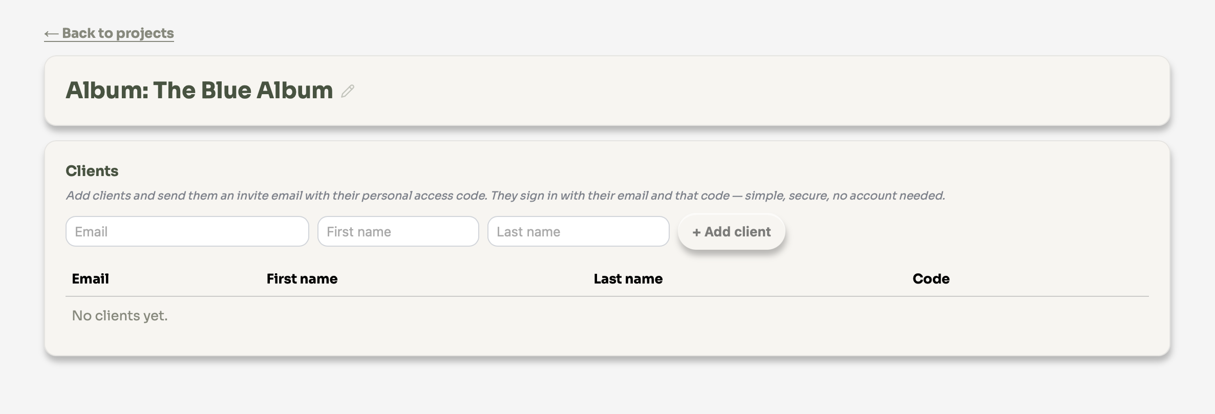 You can give clients secure, view-only access to a specific album. Each client gets a personal access code sent by email. No account or password needed.