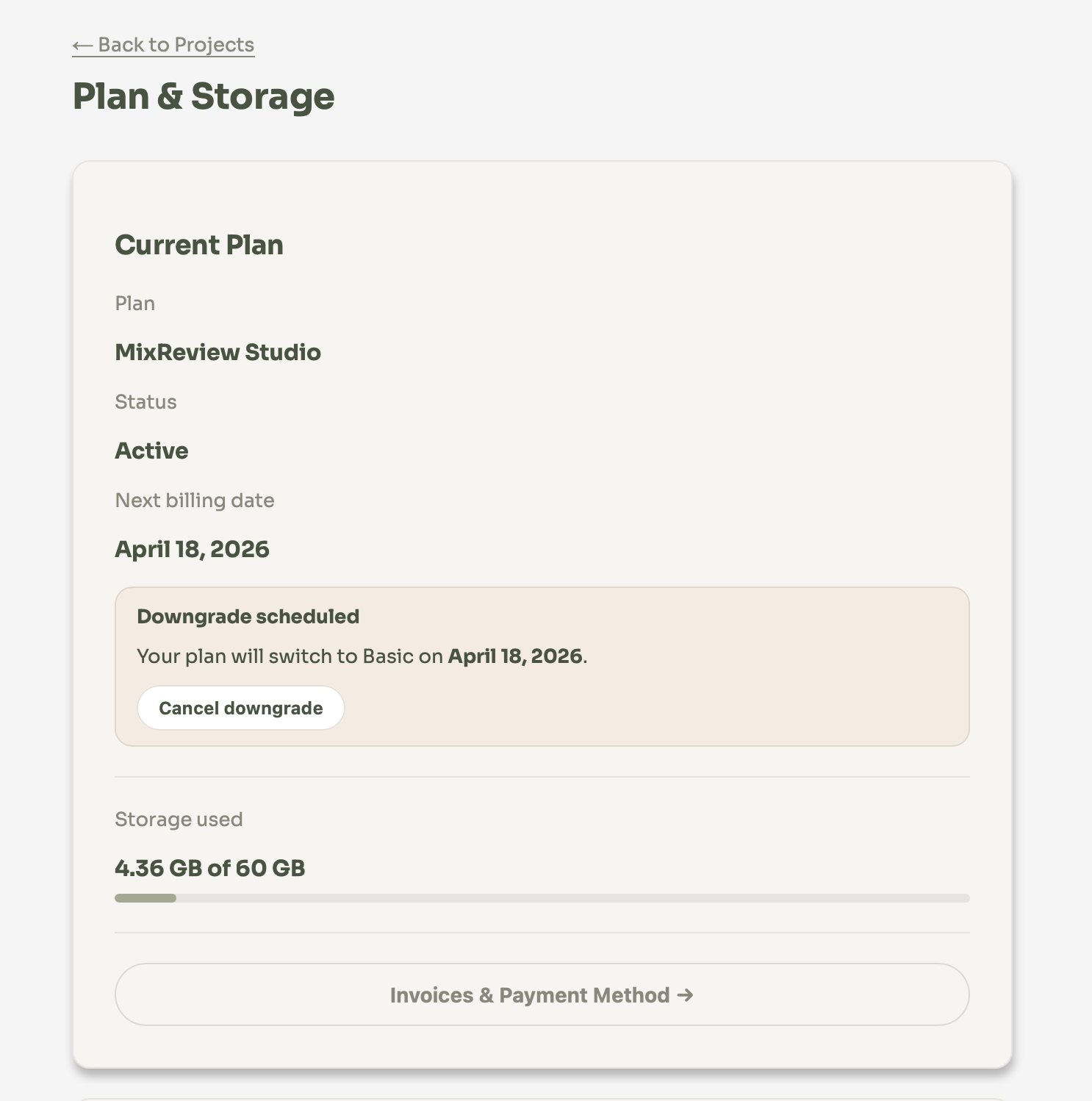If your current storage usage exceeds the limit of the new plan, a prompt will appear asking you to free up space before the downgrade takes effect. You will need to delete tracks or albums until your usage is within the new limit.