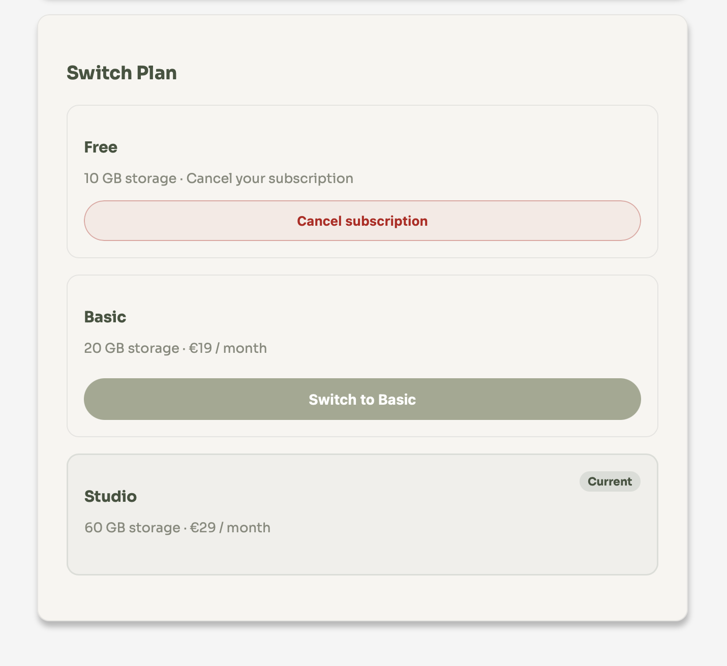 You can view and change your plan anytime under Plan & Storage in the dashboard. Your current storage usage, next billing date and available plans are all shown on one page.